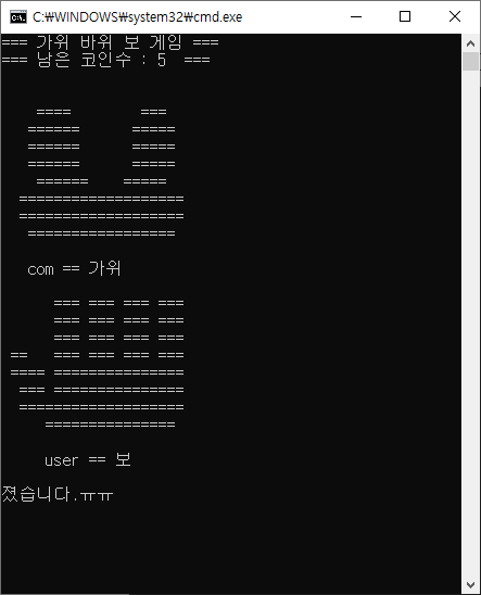 네 번째 화면에서는 컴퓨터가 낸것과 유저가 낸것이 같이 나타나게 되며 게임 결과를 알려주고