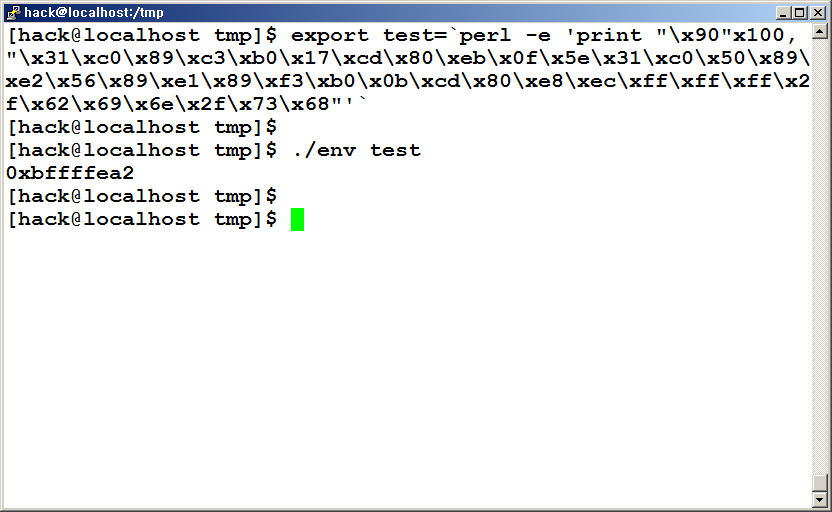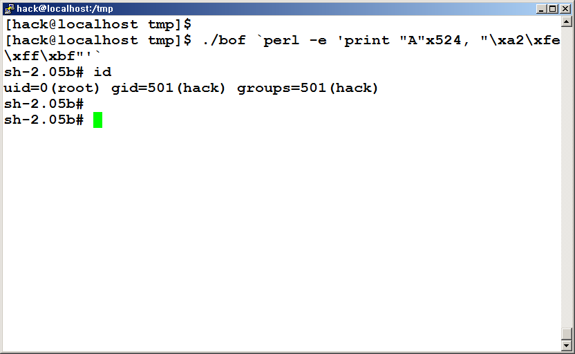 ./bof `perl -e 'print "A"x[거리], "[쉘 코드 환경 변수 주소]"'`