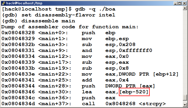 5. 취약한 함수가 쓰인 프로그램을 gdb로 확인하여 변수의 시작 부분에서 EBP까지의 거리를 확인
